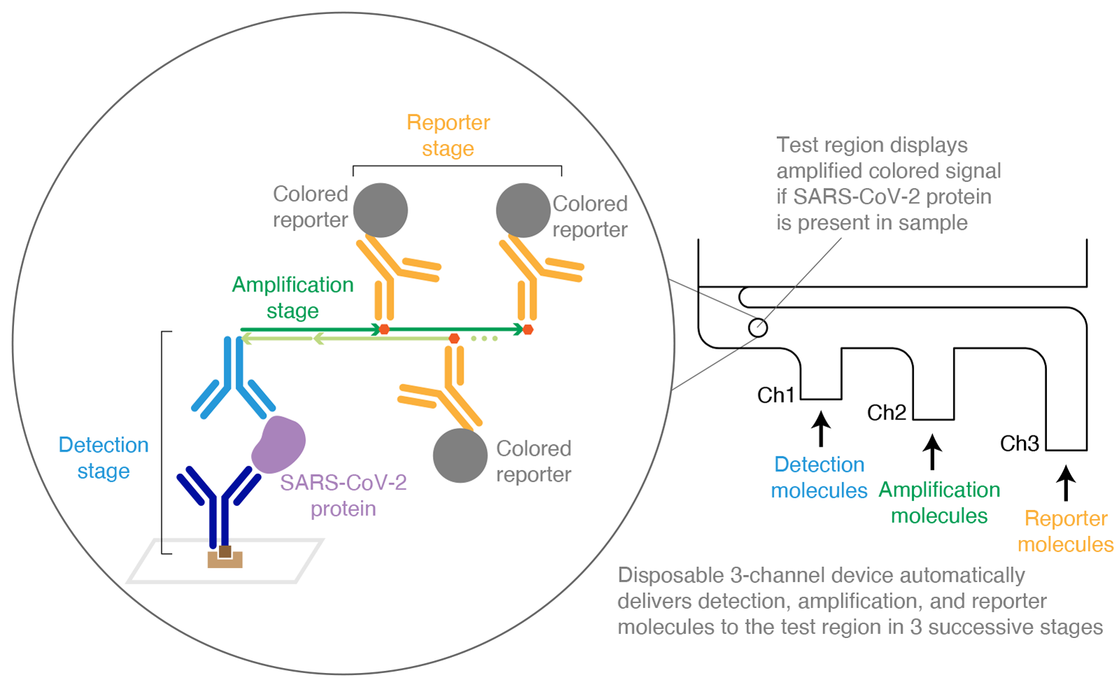 The new multi-channel at-home COVID-19 test enables an HCR amplification process to more accurately detect the presence of SARS-CoV-2 in a sample.