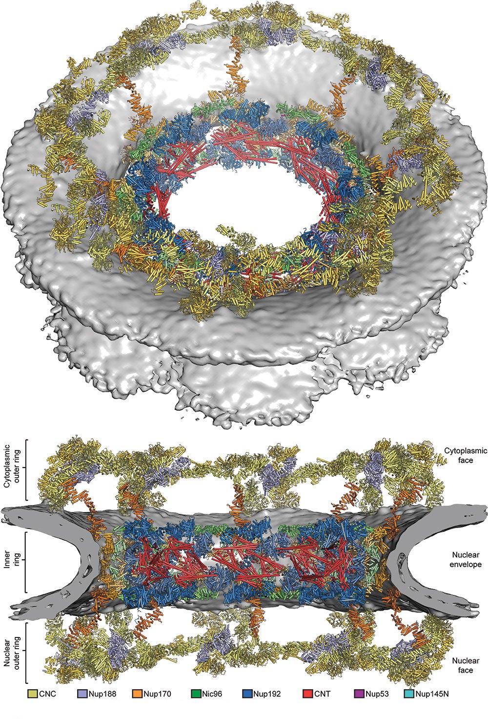 Last year, the team published two papers in Science that detailed the structures of key pieces of the NPC's inner and outer rings, which are the two primary components of the NPC's symmetric core. The donut-shaped core is embedded in the nuclear envelope, a double membrane that surrounds the nucleus, creating a selective barrier for molecules entering and leaving the nucleus.