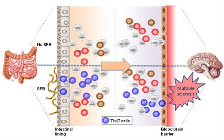 In the absence of gut bacteria, proinflammatory Th17 cells don't develop in the gut or central nervous system; animals don't develop disease (top panel). Colonization with symbiotic segmented filamentous bacteria (SFB) induces Th17 cell differentiation in the gut. Th17 cells promote Experimental Autoimmune Encephalomyelitis, an animal model for MS. In this way, non-pathogenic bacteria of the microbiota promote disease by shaping the immune response in the gut and brain (top panel).