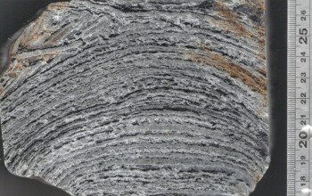 A close-up, cross-section view of the interior of a domical stromatolite. The black layers are the "cooked" organic remains of Early Archean microbial mats.