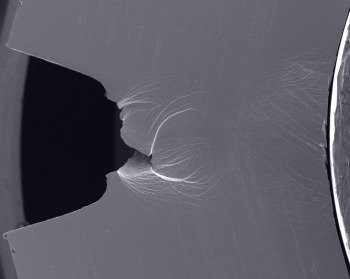 In the new palladium alloy, so many shear bands form when the material is put under stress that it "actually leads to higher toughness, because the bands interact and form networks that block crack propagation," Demetriou explains. In other words, the number of shear bands that form, intersect, and multiply at the tip of an evolved crack is so high that the crack is blocked and cannot travel very far. In essence, then, the shear bands act as a shield, preventing shattering. Thus, the palladium glass acts very much like the toughest of steels, using an analogous blocking mechanism of arresting cracks.