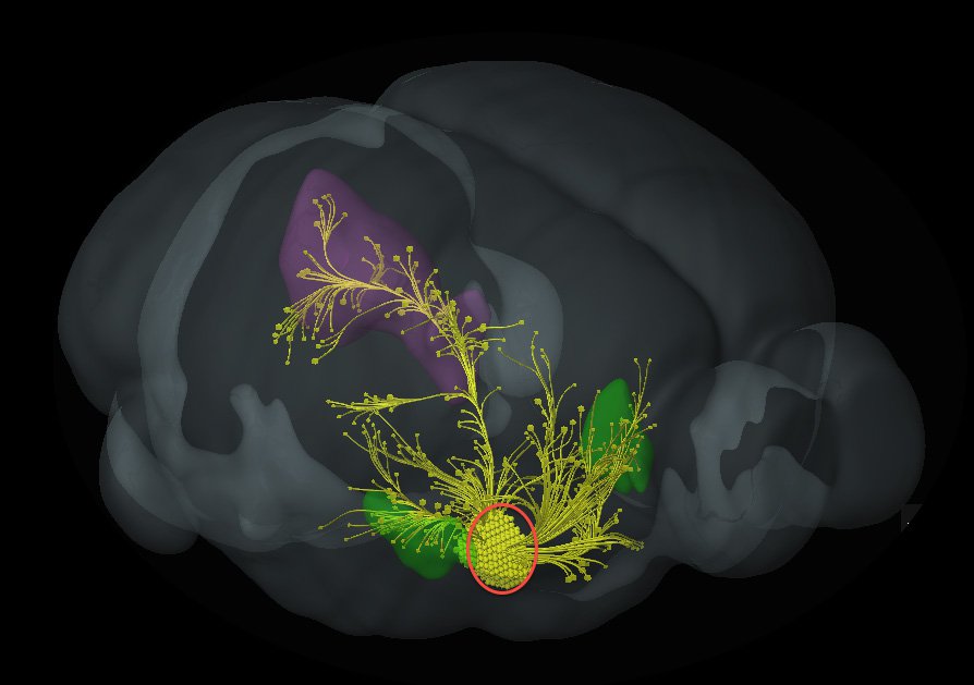 As reported in a paper published online today in the journal Nature, Caltech biologist David J. Anderson and his colleagues have genetically identified neurons that control aggressive behavior in the mouse hypothalamus, a structure that lies deep in the brain (orange circle in the image at right). Researchers have long known that innate social behaviors like mating and aggression are closely related, but the specific neurons in the brain that control these behaviors had not been identified until now.