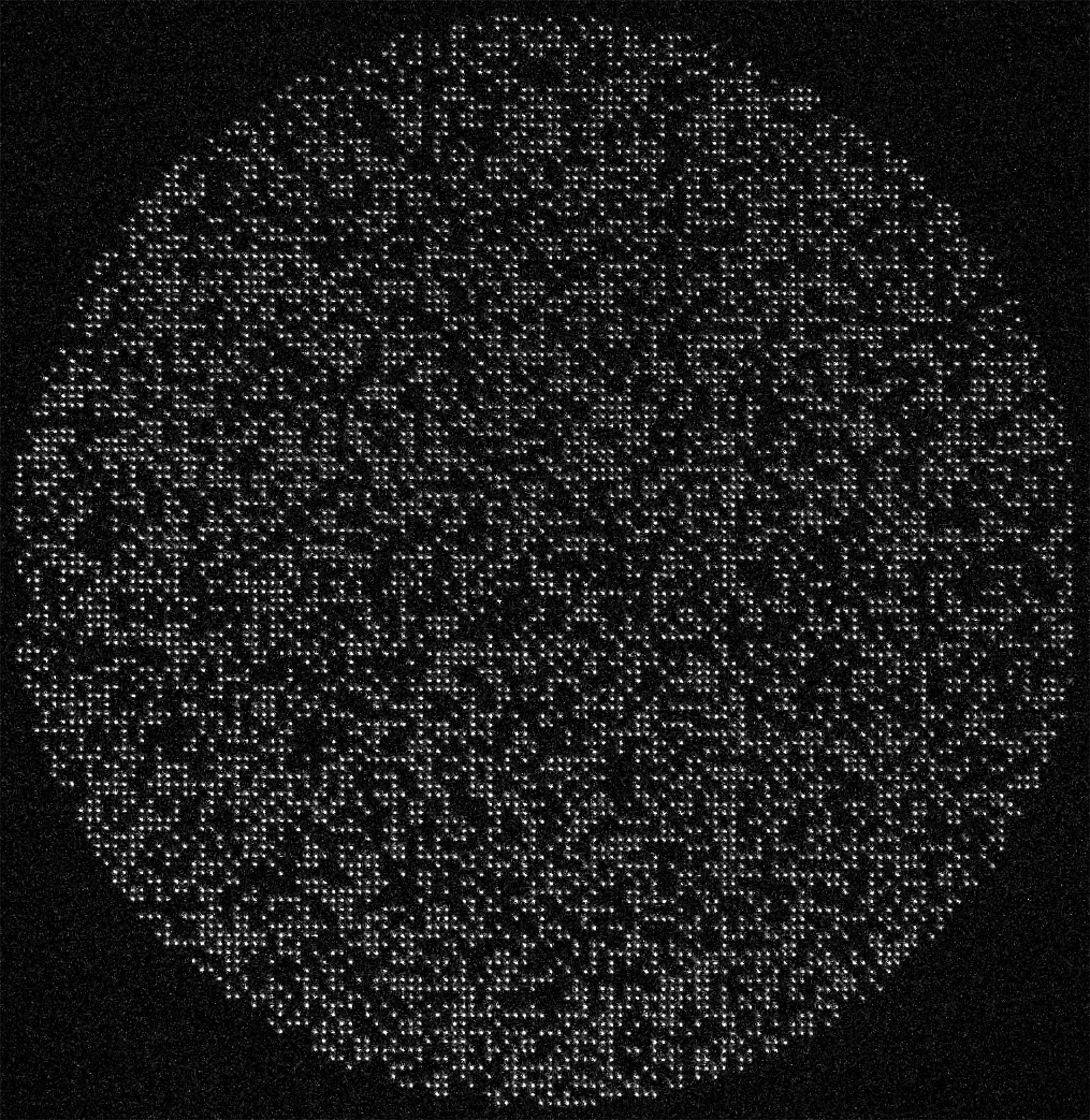 This image shows 6,100 cesium atoms trapped by highly focused laser beams called optical tweezers. The width of the circle is about one millimeter.