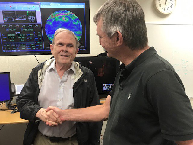 Caltech's Keith Matthews celebrates with Hilton Lewis, Keck Observatory Director, after NIRES achieves "first light."