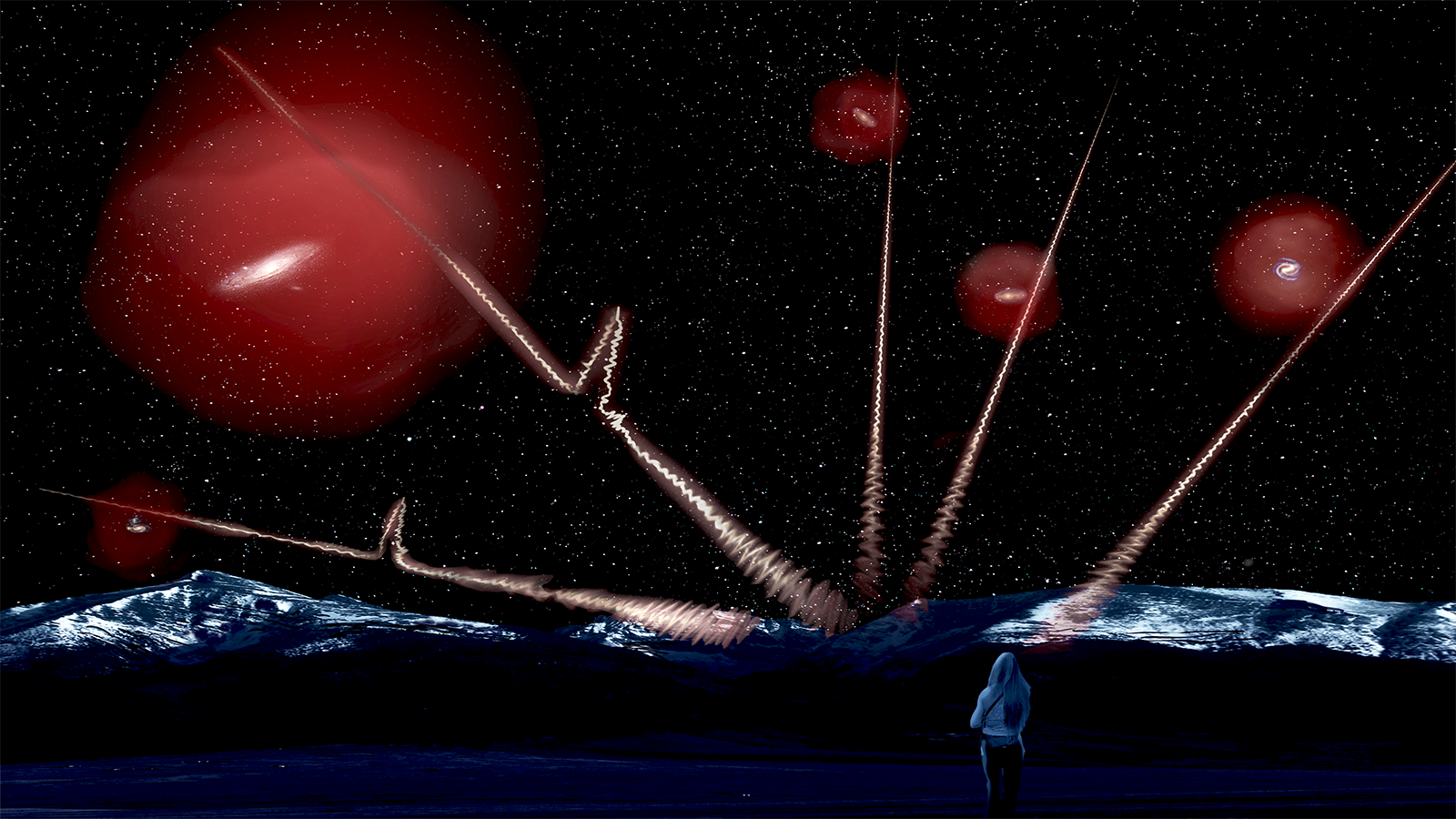 This artist's concept shows distant fast radio bursts piercing the gaseous halos around galaxies in the local universe. The radio bursts are depicted traveling from the distant cosmos, through the galactic halos, and finally reaching telescopes on Earth. The bumps seen in two of the lines represent the radio burst themselves as they travel toward Earth.