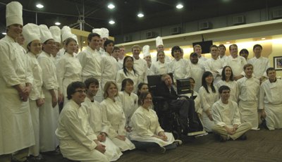 The students, dressed in white chef's coats and hats, not only cooked for Hawking but sat down for dinner with him, too, in Chandler Dining Hall. These students were born at about the time that Hawking's bestseller A Brief History of Time was first published, and for many of them, he's an icon.