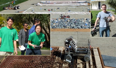 Congratulations to Chris Hallacy, Brad Saund, and Janet Chen for their victory March 8 in the 26th annual ME 72 engineering design competition. This year's theme: "Extreme Recycling." The mission: Design, build, and deploy two vehicles and traverse difficult terrain (water, sand, rocks, and wood chips, with one type of terrain in each of four different 6' x 10' boxes) to collect plastic water bottles, aluminum cans, and steel cans. During each five-minute round, the bots were to transport the recyclables and drop them (ideally, sorted by type, and—in the case of aluminum cans—crushed to less than half of their vertical height) into recycling bins, before scurrying back to the starting zone.