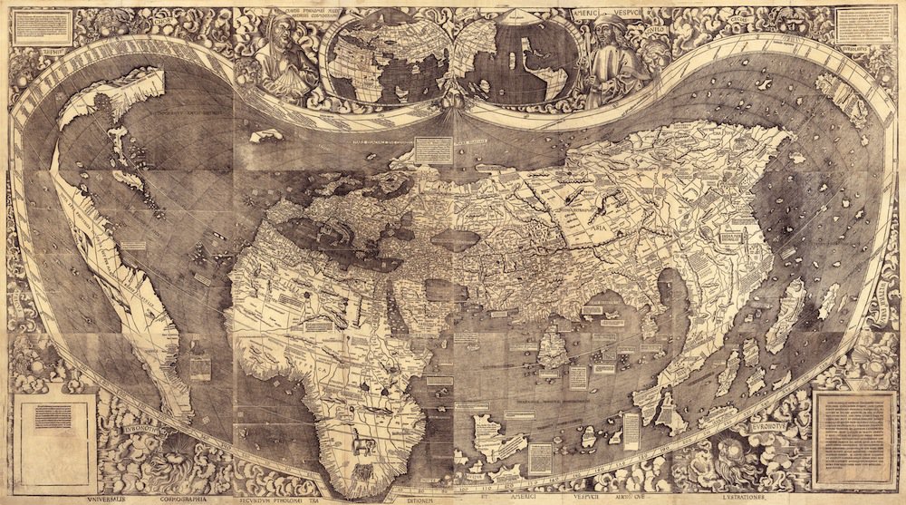 Mappa mundi (a European medieval map of the world) created by Martin Waldseemüller in 1507. The map is titled "Universalis cosmographia secundum Ptholomaei traditionem et Americi Vespucii aliorumque lustrationes (The Universal Cosmography according to the Tradition of Ptolemy and the Discoveries of Amerigo Vespucci and others)."
