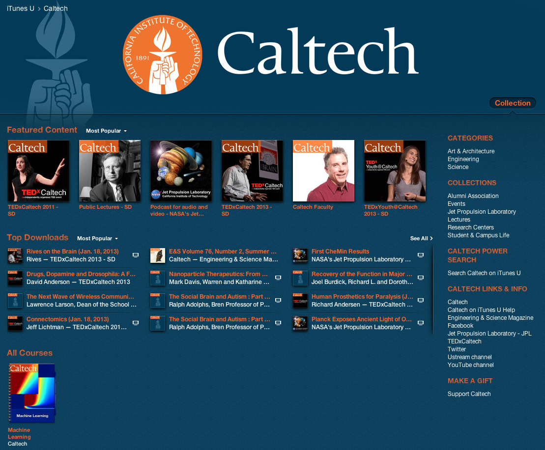 In Caltech's iTunes U section, you will find a variety of audio and video material representing the Caltech experience, including faculty discussing their work, public lecture series including Watson, Everhart, SURF, and DuBridge, and special events on campus. All the talks from TEDxCaltech as well as videos from the 2011 Distinguished Alumni Awards, commencement, and Ditch Day are available for viewing. There are also cool videos from JPL and the Keck Institute for Space Studies.