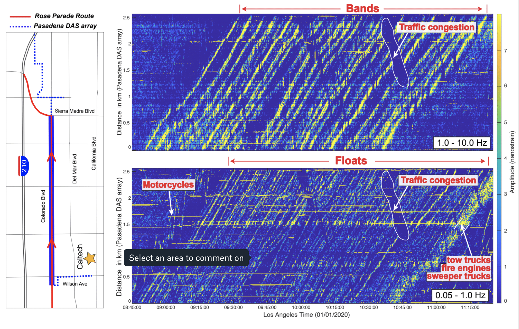"The Rose Parade is an amazing cultural event in Pasadena, and the floats and bands run right on top of our newly established fiber seismic array," says Zhongwen Zhan (MS '08, PhD '13), assistant professor of geophysics and the lead researcher on the fiber optic project. Zhan is the corresponding author of a paper about the Rose Parade's seismic signature, published on May 6 in Seismological Research Letters.