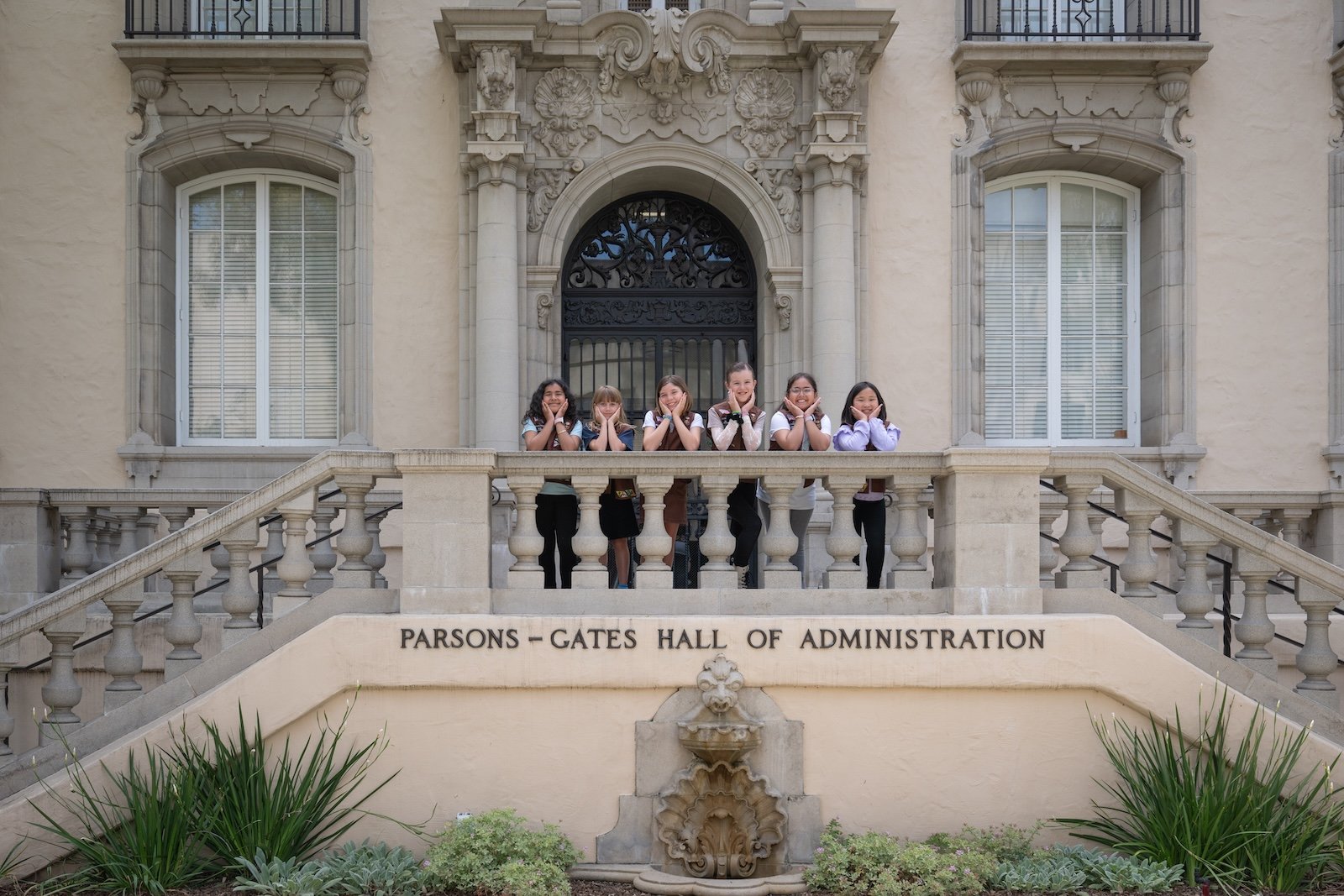 The six visiting Girl Scout Brownies smile at the entrance to Caltech's Parsons-Gates Hall of Administration.