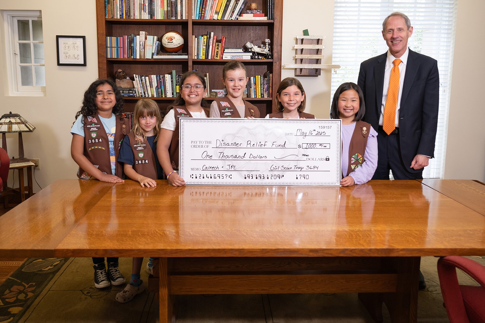 The girls, all starting fourth grade in fall 2025, raised $1,000 in cookie-sale earnings for the Caltech and JPL Disaster Relief Fund. Six troop members visited the office of Caltech President Thomas F. Rosenbaum, the Sonja and William Davidow Presidential Chair and professor of physics, to present their check.