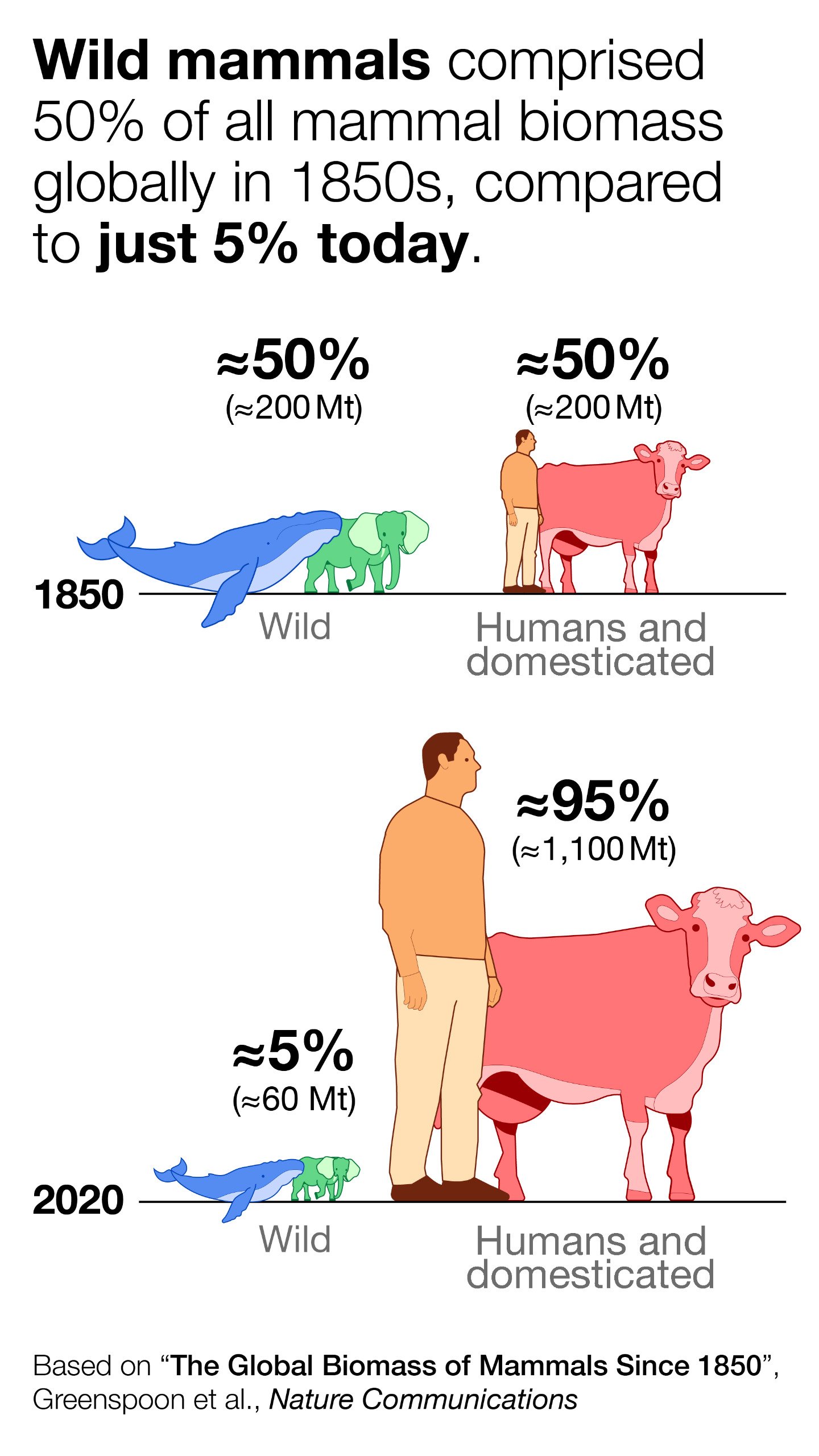 Two new studies quantify key features of human and animal presence on Earth. The first study finds that the movement of human biomass today is 40 times greater than that of all wild land mammals, birds, and arthropods combined. Another study reveals that the combined biomass of wild land and marine mammals has plummeted by about 70 percent since 1850, whereas the biomass of humans has soared by roughly 700 percent and that of domesticated animals by 400 percent; those two categories have a combined biomass approaching about 1.1 billion tons.