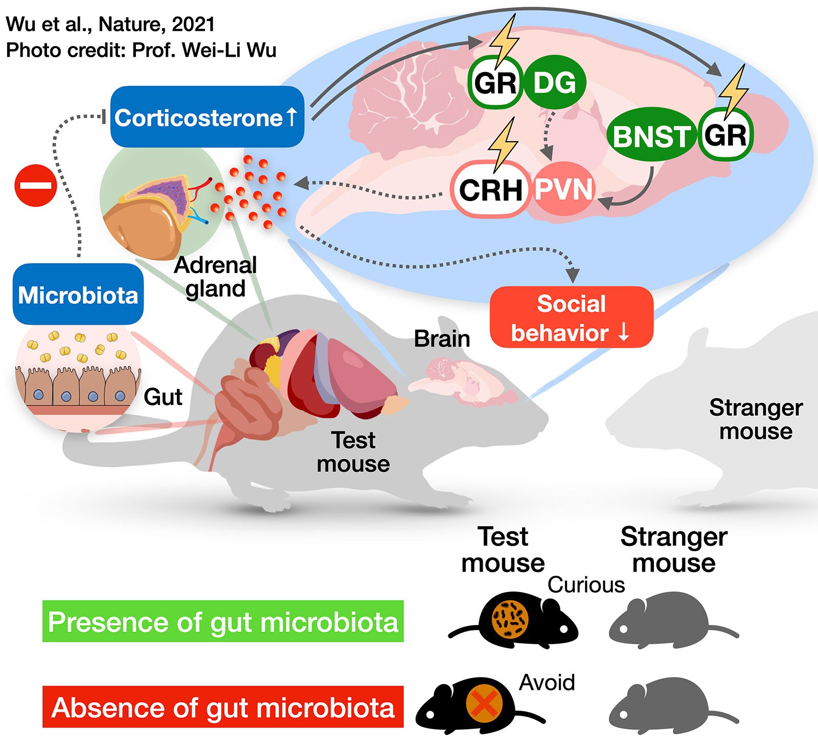 It had already been shown that, on a chemical level, germ-free mice have significantly higher levels of the hormone corticosterone (the analog of the so-called stress hormone, cortisol, in humans) than mice with healthy microbiomes. The team of researchers, led by former Mazmanian lab postdoctoral scholar Wei-Li Wu, aimed to identify the neurons that were both affected by corticosterone and played a role in social behaviors.