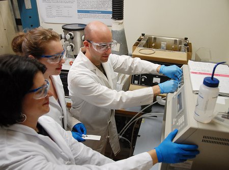 Damage to cellular DNA lies at the root of many serious disorders, including cancer. From left, graduate students Pam Sontz, Anna Nordstrom, and Eric Olmon working in Professor Jackie Barton's lab, are conducting fundamental research into how specific proteins in the body recognize and initiate repairs to damaged DNA, and what causes this maintenance system to go awry. This work is shedding light on the origins of numerous diseases and could lead to the development of powerful new treatments.