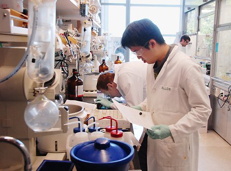 What do an endangered sea slug and cancer patients have in common? A compound produced by the first may one day treat the second. In the lab of Professor Brian Stoltz, grad students Allen Hong, Nathan Bennett, and (in the back) Chris Gilmore are creating synthetic replicas of medicinal substances produced by plants and animals, some of them rare or endangered. This research could ultimately lead to large-scale production of potent new disease-fighting drugs.