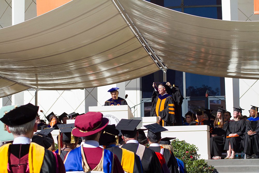 Lee opened the ceremony with a few words about why the inauguration of a new president is special to the legacy of Caltech. "Today is not only about the future," he said, "it is also a day of honoring and celebrating the Institute's history. And what better time to do that than as we open a new chapter in that history."