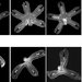A single ephrya (juvenile Aurelia jellyfish) was split into a three-armed section (bottom) and a five-armed section (top). Within two days of the amputation, neither section regenerated the lost arms. Instead, each section mechanically reorganized itself to reform radial symmetry with its remaining arms. Shown above, from left to right, are the ephryae immediately after amputation, then at 6 hours, 18 hours, and finally 50 hours.