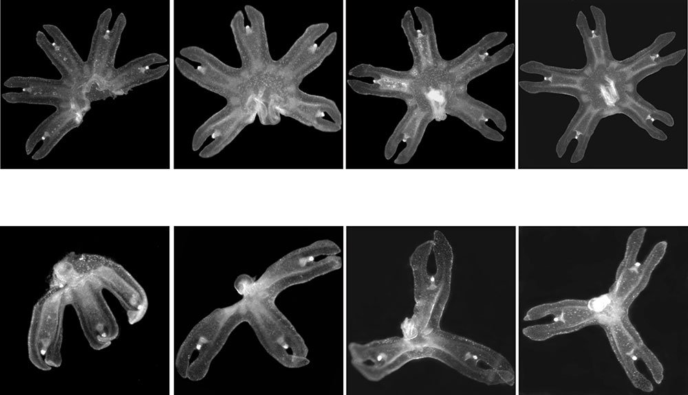 Caltech researchers were able to observe in the lab how different ephryae would regain radial symmetry with their remaining arms. Shown here from left to right are ephryae that have reorganized themselves to be radially symmetrical with only two, three, four, five, six, and seven arms.