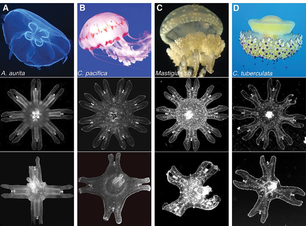 More species than just Aurelia displayed symmetrization: four species of the Scyphozoan jellyfish—the moon jellyfish Aurelia aurita (shown in column A); the sea nettle Chrysaora pacifica (shown in column b); the lagoon jellyfish Mastigias sp (shown in column c); and the Mediterranean jellyfish Cotylorhiza tuberculata (show in column d). For each column, row 1 shows the adult medusa, row 2 shows uncut eight arm ephyrae, and row 3 shows the ephryae that have reorganized themselves with four arms.