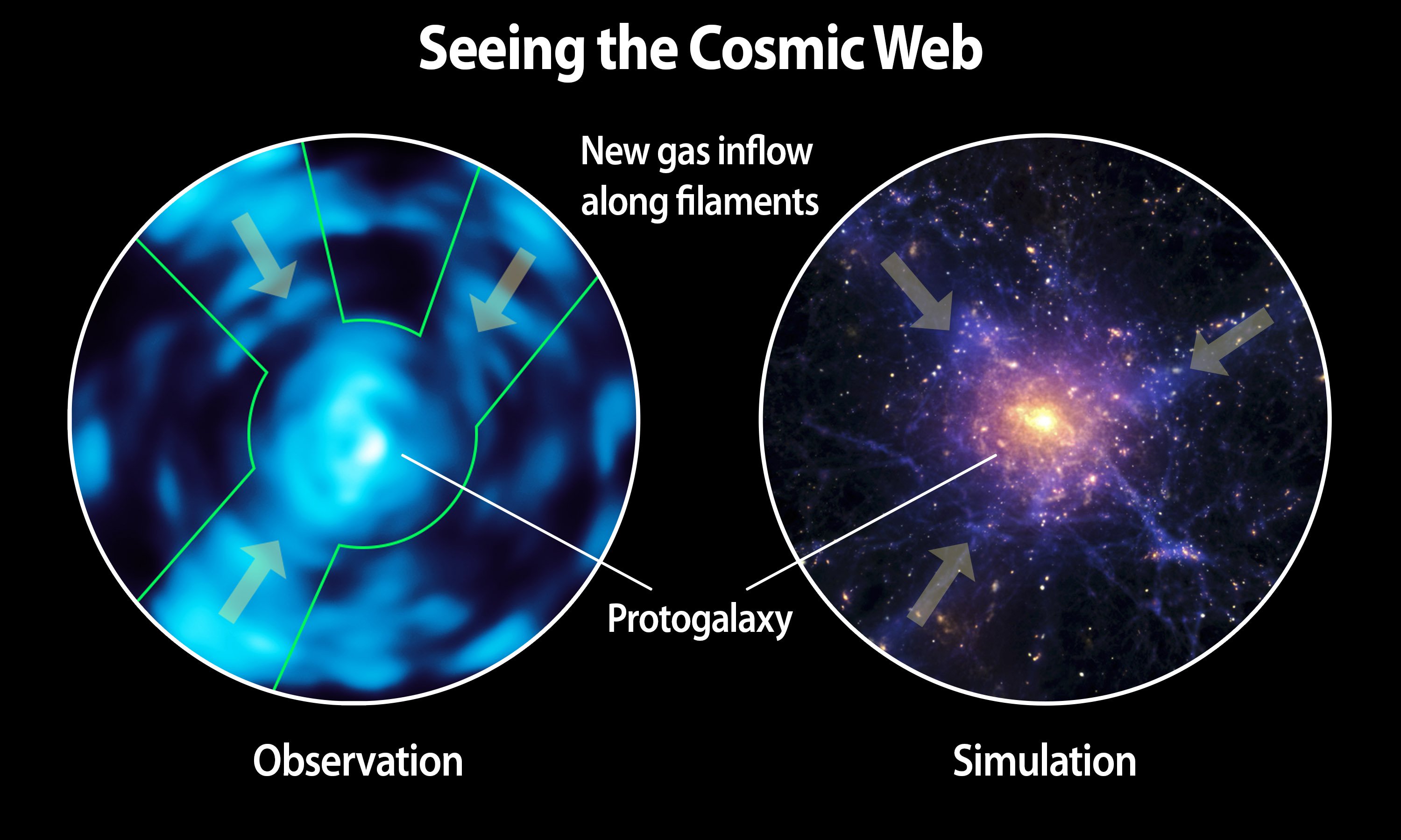 Since the late 1980s and early 1990s, theoreticians have predicted that primordial gas from the Big Bang is not spread uniformly throughout space, but is instead distributed in channels that span galaxies and flow between them. This "cosmic web"—the IGM—is a network of smaller and larger filaments crisscrossing one another across the vastness of space and back through time to an era when galaxies were first forming and stars were being produced at a rapid rate.