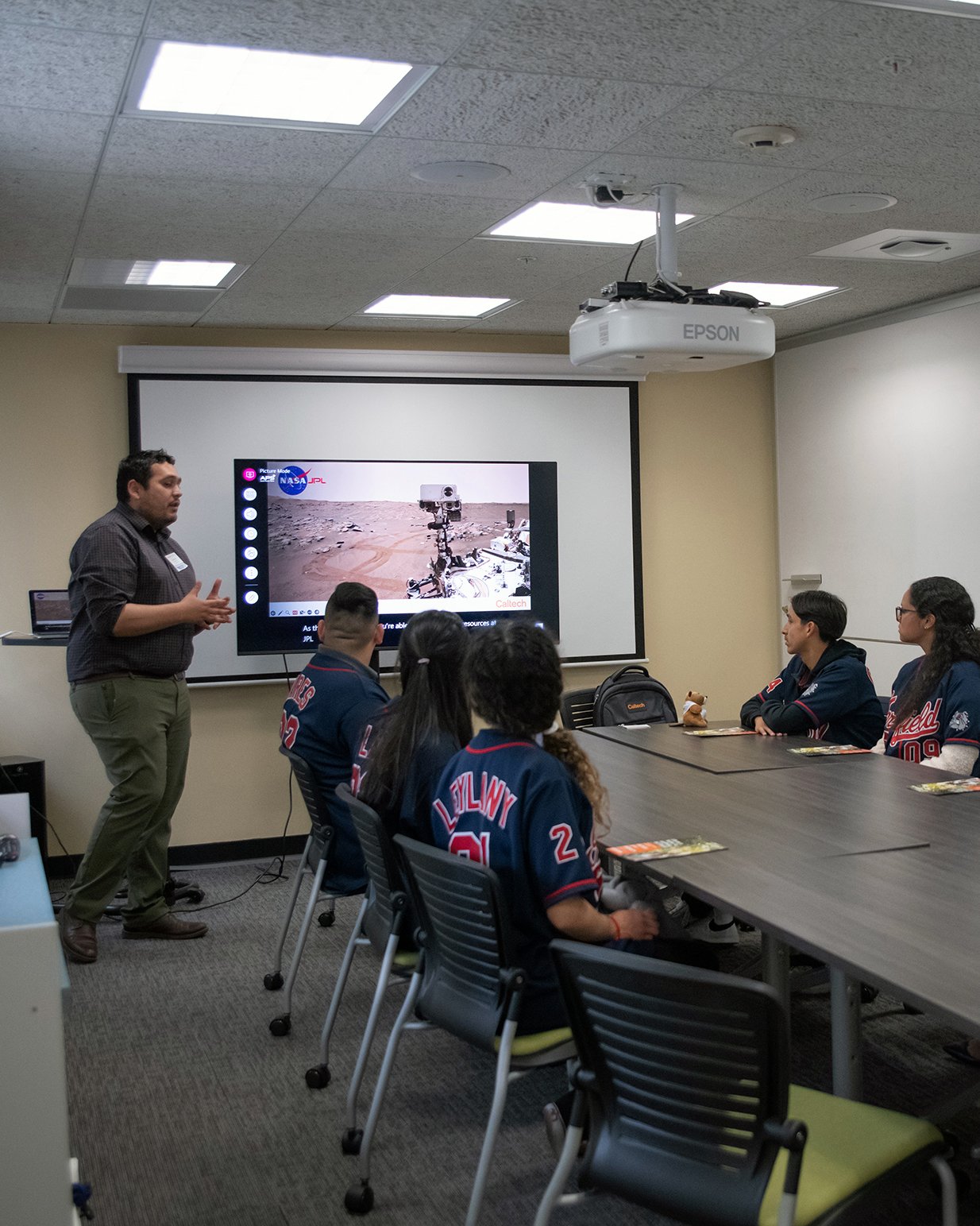 As part of their visit, the Garfield High students heard from Caltech admissions counselor Andres Diaz, who explained how to apply for admission and offered tips for college readiness.