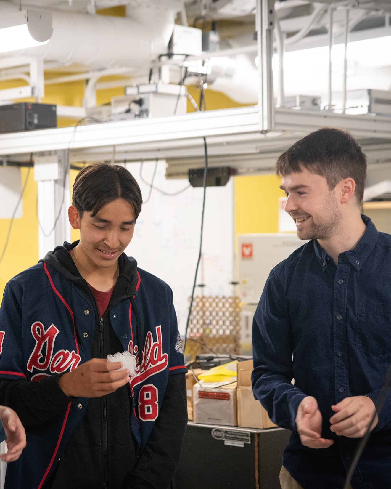 Garfield High junior Steven Garcia holds a newly engineered material in the Daraio laboratory as mechanical engineering graduate student Alex Ogren looks on.