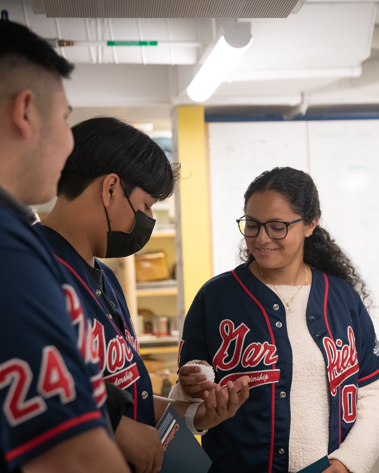 Garfield High junior Ashley Fernandez passes a material engineered in the Daraio laboratory to sophomore Giovanni Ramirez as junior Saul Mares looks on.