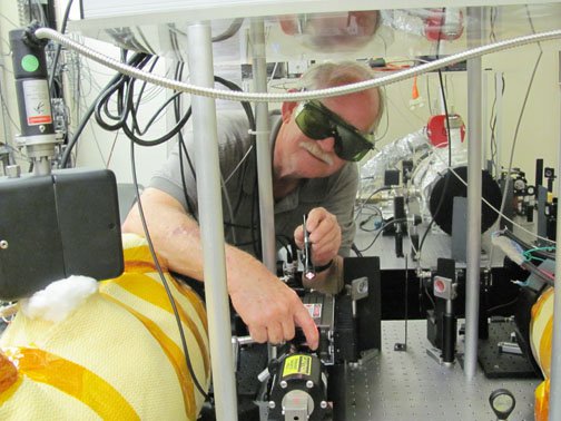 His eyes shielded by protective goggles, Bob Taylor carries out material testing in LIGO's Optical Contamination Test Cavity Lab, where he spends several hours a week measuring the cleanliness of semiconductors, plastics, and other materials destined for use in LIGO's state-of-the-art interferometers.