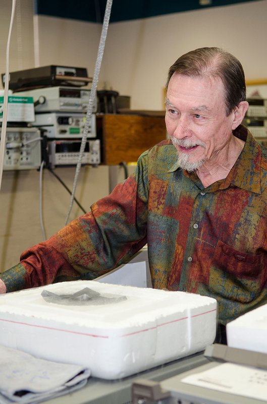 Carver Mead prepares an experiment in which a magnet levitates over a high-temperature superconductor.