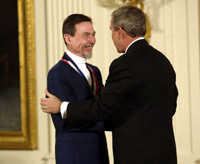 Carver Mead accepts the National Medal of Technology from President Bush in 2002.