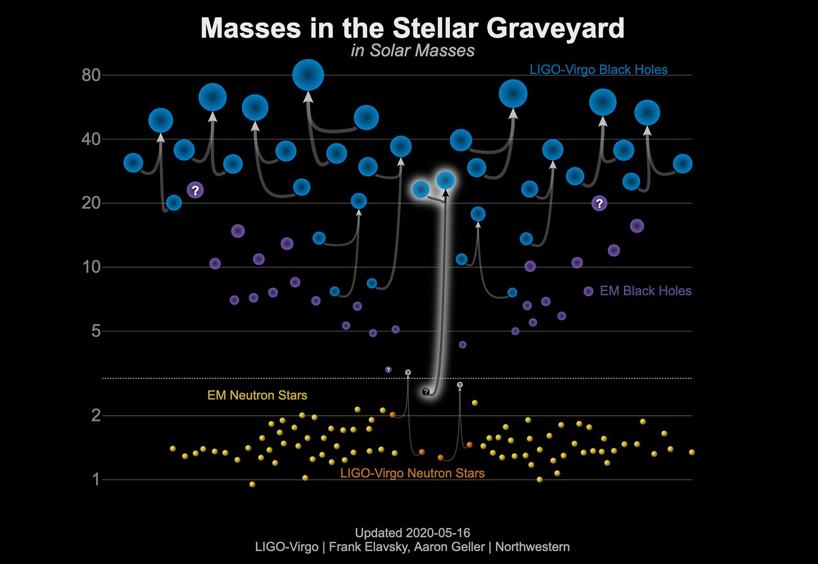 This graphic shows the masses for black holes detected through electromagnetic observations (purple), the black holes measured by gravitational-wave observations (blue), the neutron stars measured with electromagnetic observations (yellow), and the neutron stars detected through gravitational waves (orange). GW190814 is highlighted in the middle of the graphic as the merger of a black hole and a mystery object around 2.6 times the mass of the sun.