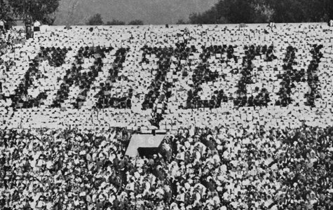 Fifty years ago, Washington Huskies fans at the 1961 Rose Bowl game between the Huskies and the Minnesota Golden Gophers received instructions to take colored flip-cards off their seats and hold them above their heads, producing gigantic images for the millions of fans watching on TV. One pattern was meant to spell "Huskies," another to reveal a picture of said dog. But one of the images curiously appeared to be a creature with buck teeth and round ears, and then the cards spelled out an even bigger surprise: "CALTECH." Read more about the Great Rose Bowl Hoax in the Los Angeles Times and Legends of Caltech.