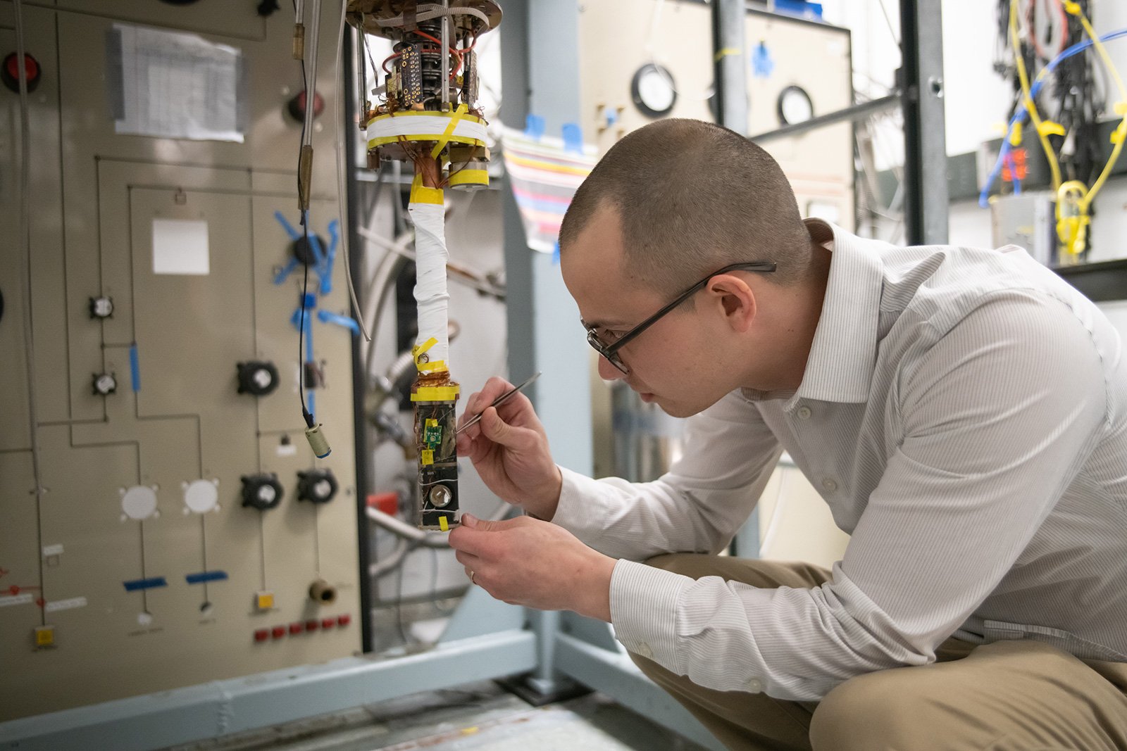Christopher Simon is pictured in the lab working on an apparatus to make magnetic measurements at cryogenic temperatures.