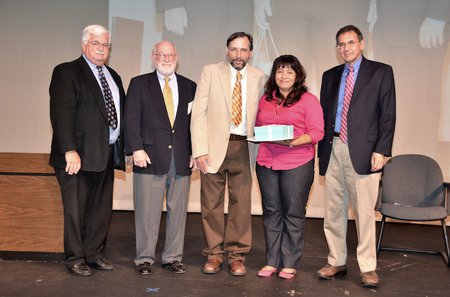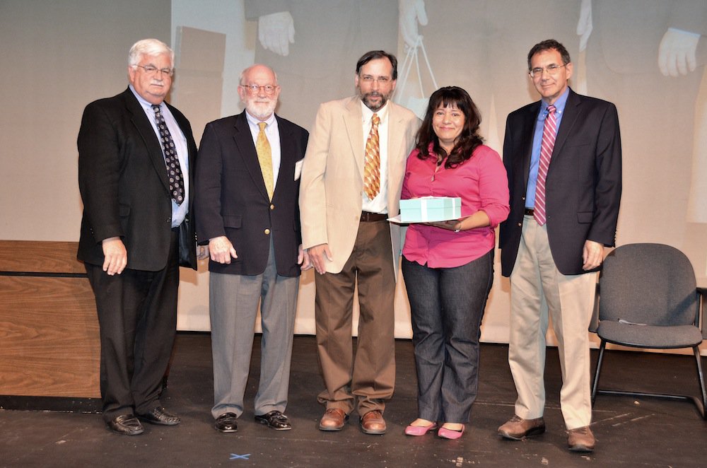 From left to right: Ted Jenkins (Caltech Board of Trustees), Thomas Schmitt (founder of the Schmitt Prize), Joseph Shepherd (Dean of Graduate Studies), Maria I. Lopez, and Edward Stolper (Interim Caltech President)