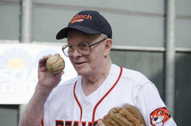 Now 97, Levet returned to campus last Friday to throw out the first pitch for Caltech against Oxy.