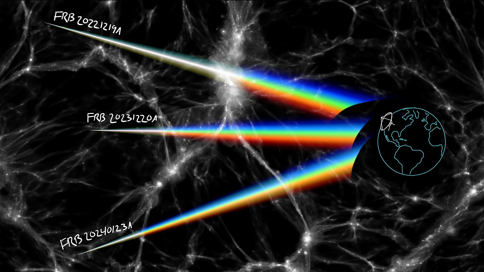 This artist's diagram depicts some of the 60 FRBs in the study—FRB 20221219A, FRB 20231220A, and FRB 20240123A—which were used to track the journey of gas through the space between galaxies and map the cosmic web.