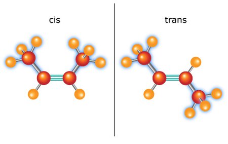 To understand that geometry, think first of trans fats. Like other fats, trans fats are essentially chains of fatty acids that contain carbon-carbon double bonds. The "trans" refers to the geometry or configuration of groups of atoms with relation to those double bonds—they can be either trans or cis. If the groups of atoms connected to the carbons of the double bond are located kitty-corner to each other, they exist in the trans configuration; if they are on the same side, the bonds are cis double bonds. Natural fats contain cis double bonds. Trans fats are formed during chemical processing, and the unnatural fats have been found to be unhealthy.