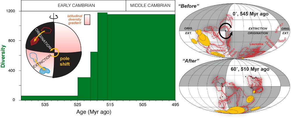 A rapid reorientation of the latitudinal diversity gradient due to true polar wander may explain both the biological and ecological effects and paleontological artifacts of the Cambrian "explosion". [View Full Size]