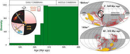 "It's long been observed that biological diversity is highest in the tropics, where nutrients and energy tend to be abundant," says Kirschvink. "One of the side effects of true polar wander is that sea level rises near the equator but falls near the poles, so the equatorial migration of most Cambrian land masses would have enhanced diversification into previously lower-diversity environments."