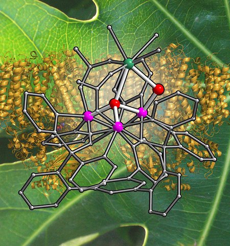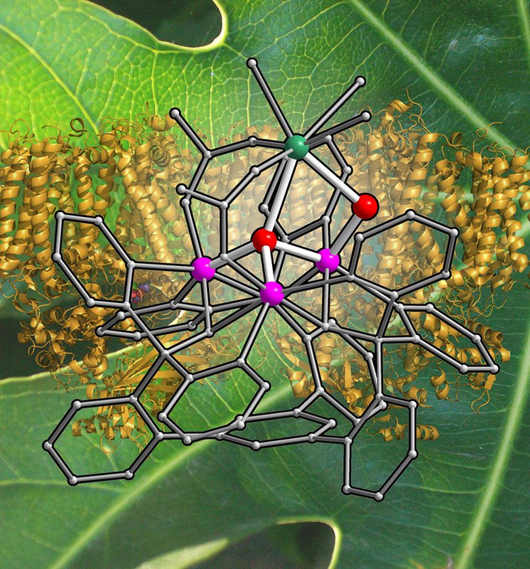 This illustration depicts a metal cluster prepared in the Agapie group on a background of photosystem II, the protein complex that performs photosynthesis in leaves.