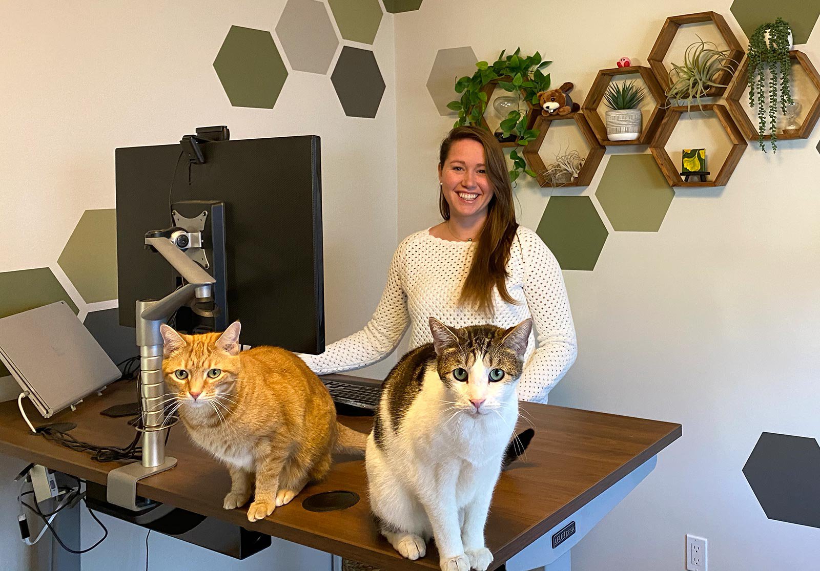 Kirby Nielsen at home with her two cats, Aslan and Ender.