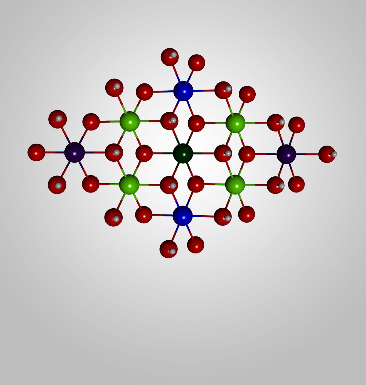 A graphical representation of the molecular structure of the solar-fuel catalyst developed at Caltech. Blue represents iron atoms; green is nickel; red is oxygen; white is hydrogen.
