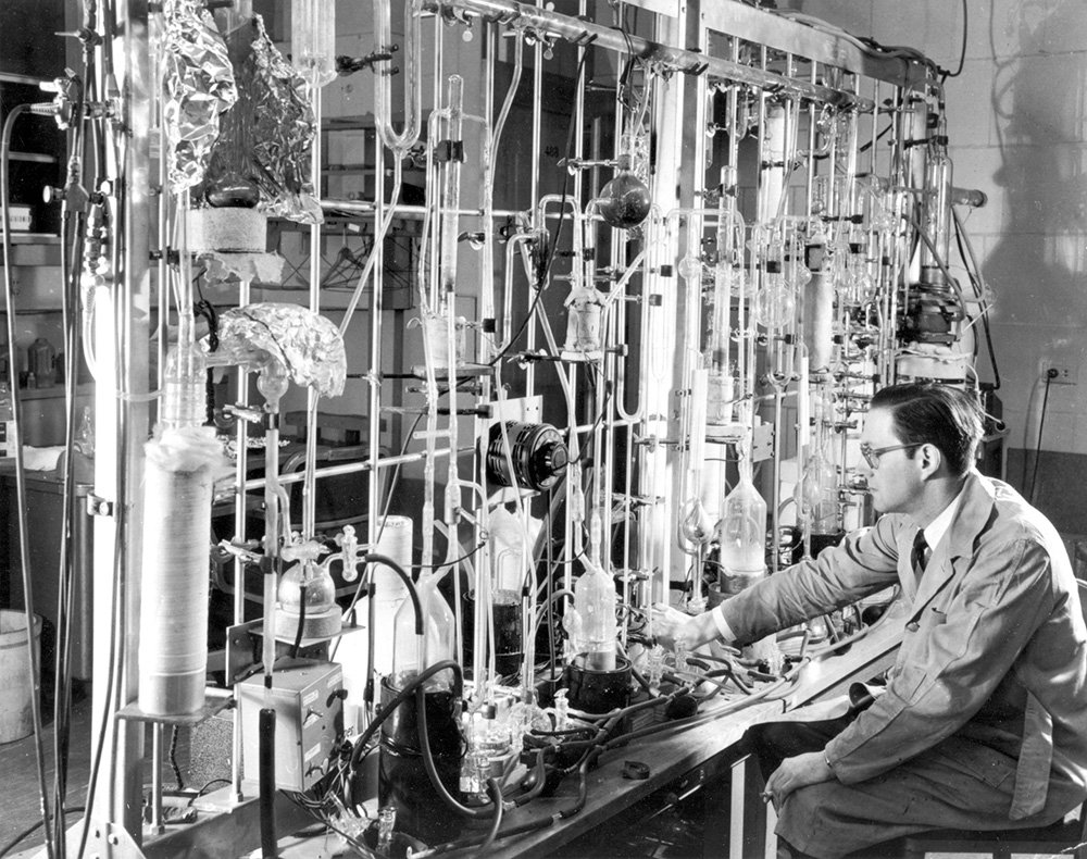 Gerald Wasserburg working with the vacuum line in his laboratory, circa 1953-1954