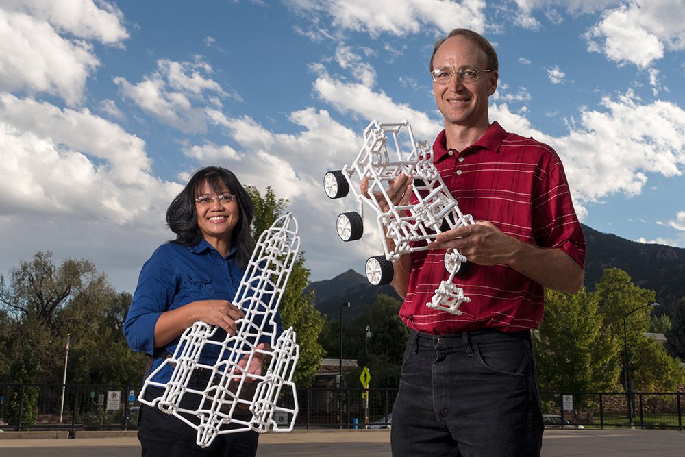 Monica (BS '95) and Charles Sharman (BS '95) with models built using Crossbeams