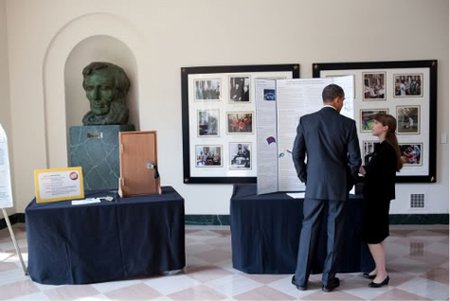 I was contacted to come to the White House less than a week before the "science fair." The whole event came together very quickly, and when we arrived the projects took up more space than they had anticipated, so five of the projects—including mine—were moved to a different room downstairs. We were told that Obama would go through the room where the majority of the projects were set up, then he would give his speech to the press, and he would leave without seeing our projects.