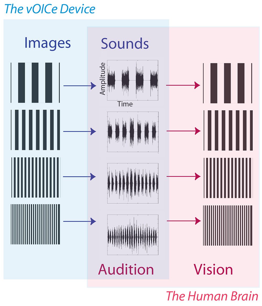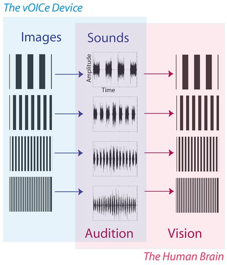 Depiction of the vOICe encoding scheme. A camera mounted on glasses records video that is converted to sound by a computer and transmitted to headphones in real time.