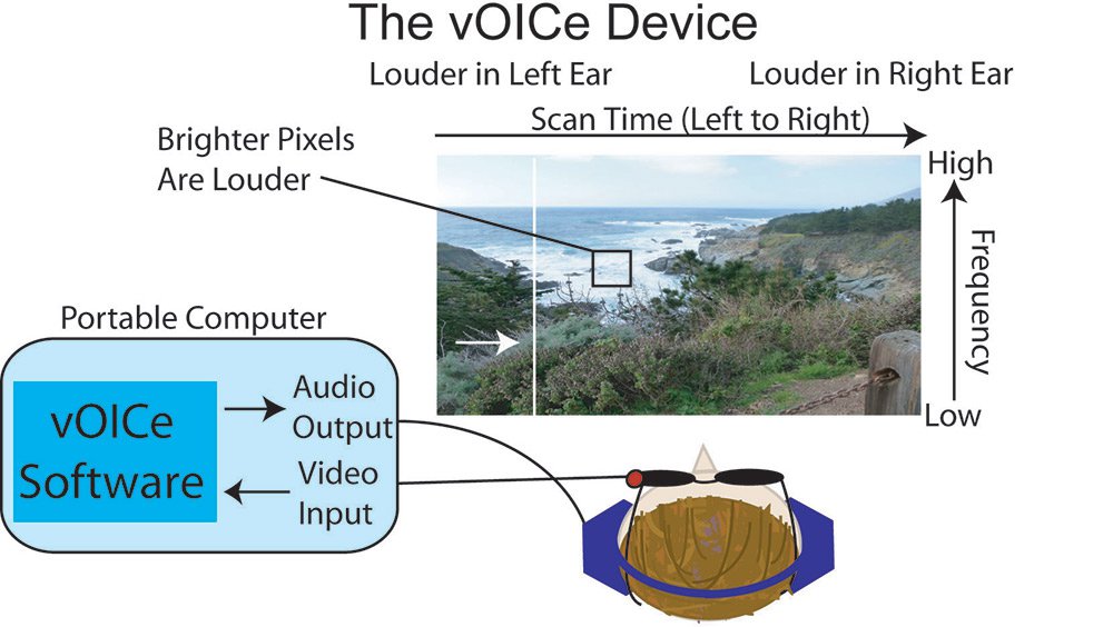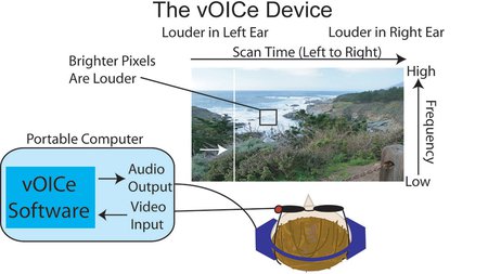 The vOICe device is made up of a small computer connected to a camera that is attached to darkened glasses, allowing it to "see" what a human eye would. A computer algorithm scans each camera image from left to right, and for every column of pixels, generates an associated sound with a frequency and volume that depends upon the vertical location and brightness of the pixels. A large number of bright pixels at the top of a column would translate into a loud, high-frequency sound, whereas a large number of lower dark pixels would be a quieter, lower-pitched sound. A blind person wearing this camera on a pair of glasses could then associate different sounds with features of their environment.
