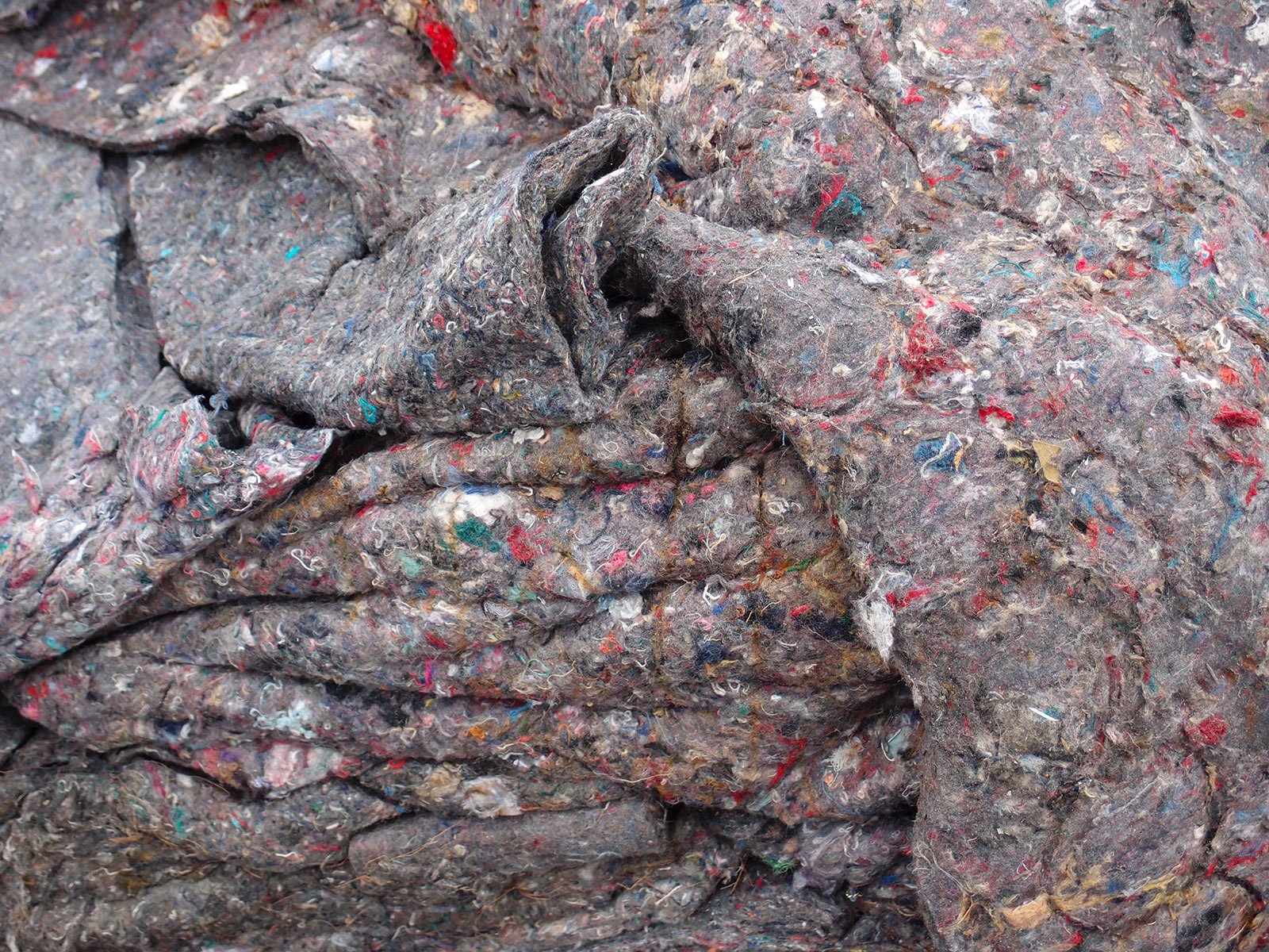 Material produced from reclaimed textiles for use in the mattress industry, photographed in West Yorkshire, United Kingdom.