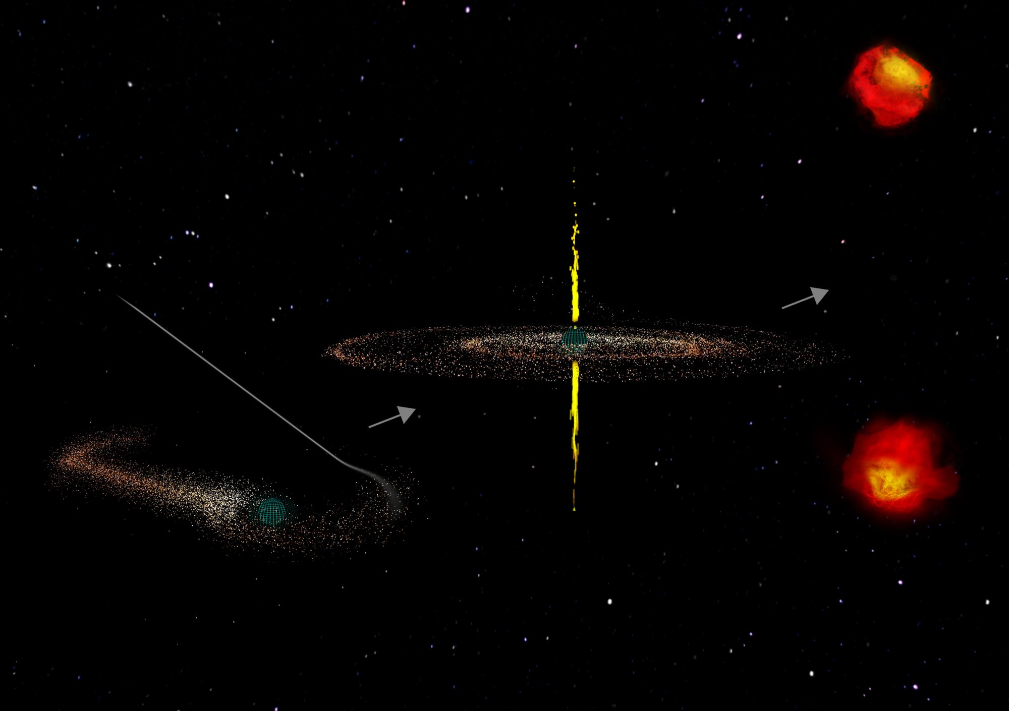 This illustration shows how Compact Symmetric Objects, or CSOs, likely form. When a single, massive star wanders too close to a black hole (left), it is devoured. This causes the black hole to shoot out an ultrafast, bipolar jet (center). The jet extends outward and its hot ends glow with radio emissions (right).